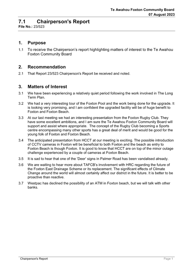 1. Purpose 1.1 To receive the Chairperson’s report highlighting matters of interest to the Te Awahou Foxton Community Board