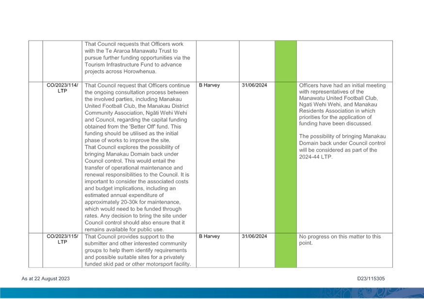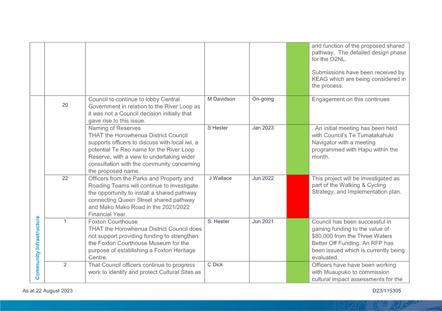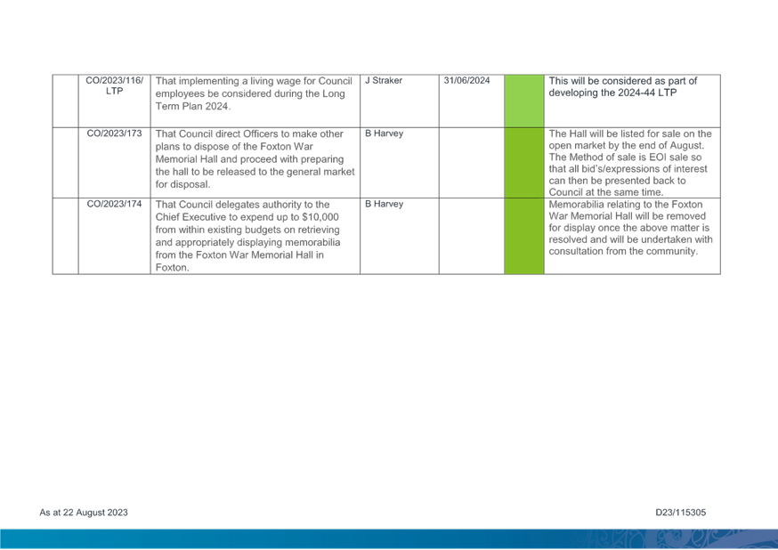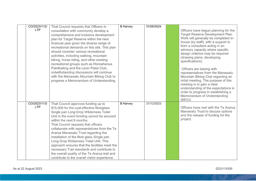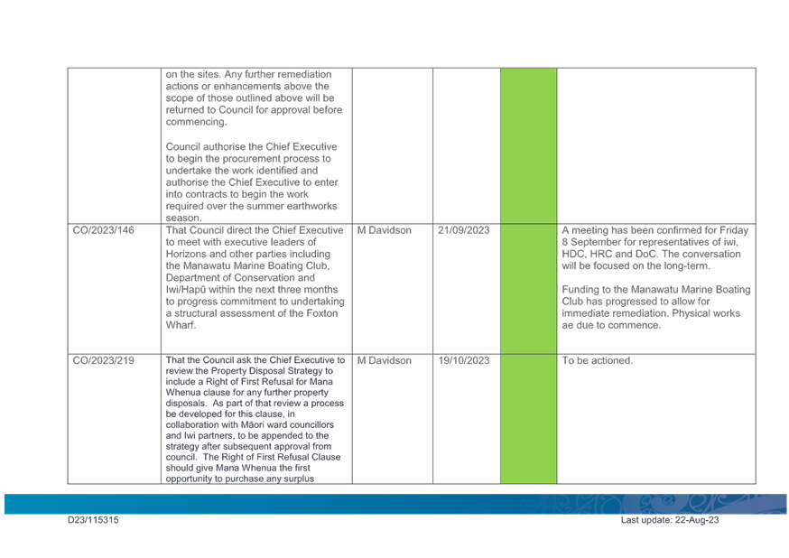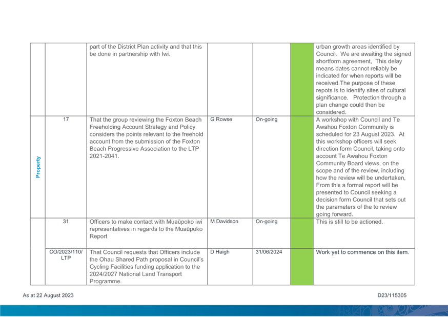 1. Purpose 1.1 To present to Te Awahou Foxton Community Board the updated monitoring report covering requested actions from previous meetings of the Board. This report incorporates updates related to the Foxton and Foxton Beach areas from the Long Term Plan Monitoring Report presented to Council on 19 July 2023 |