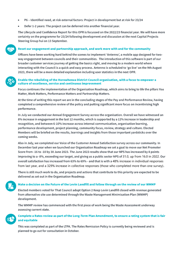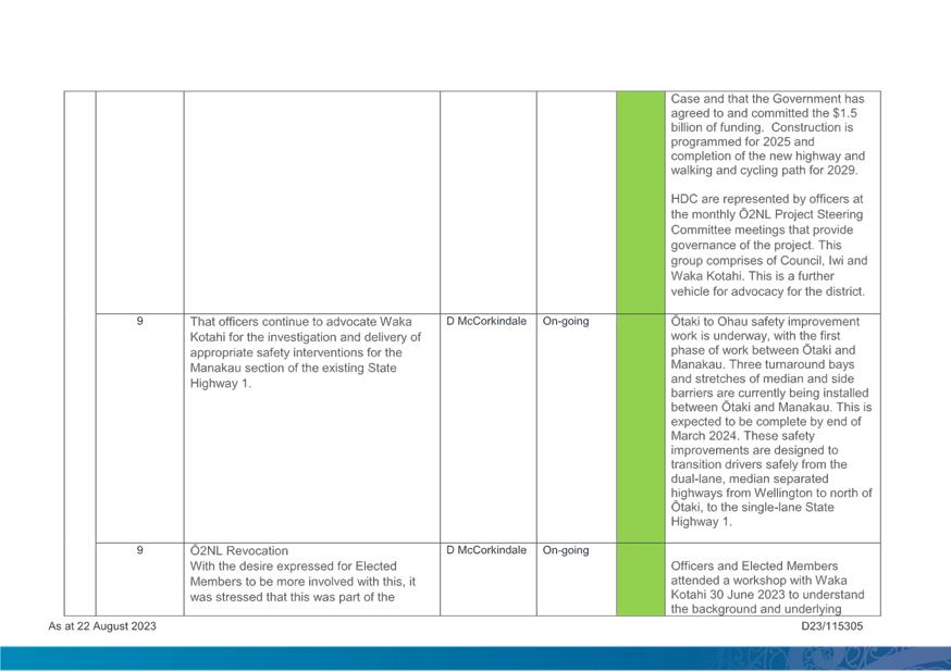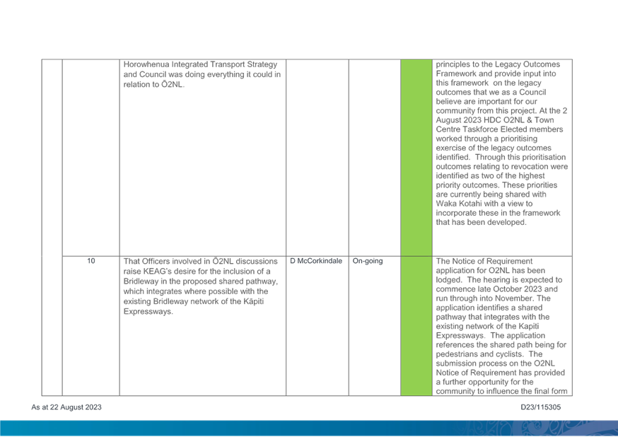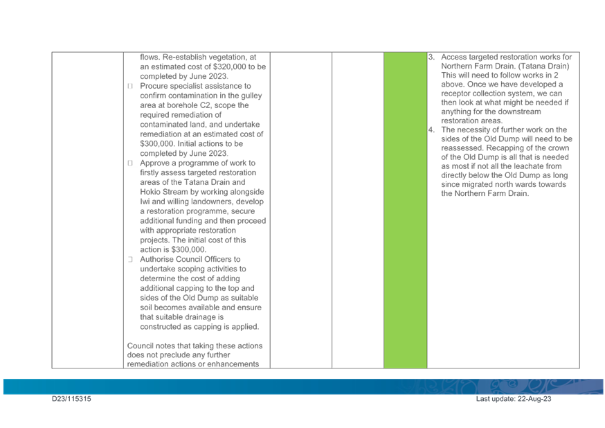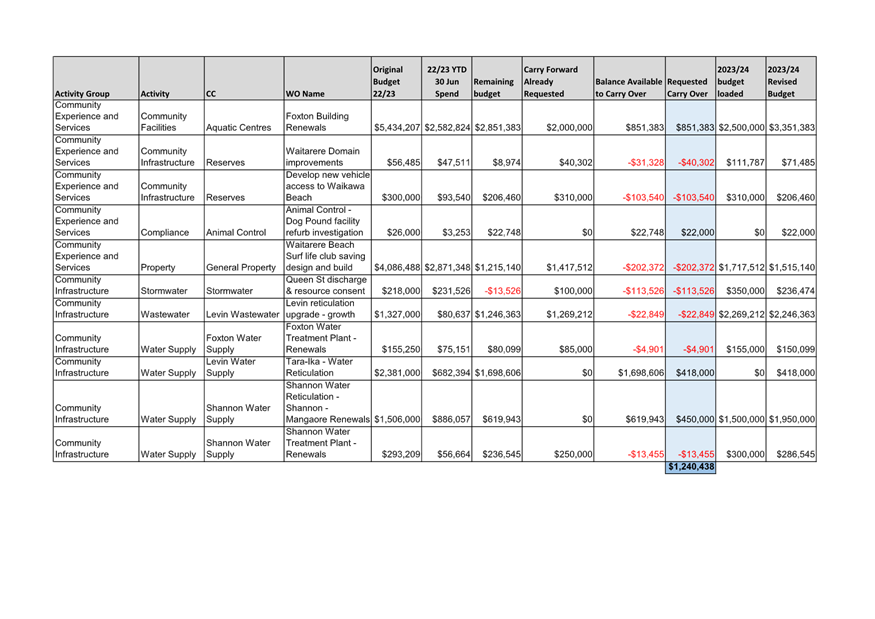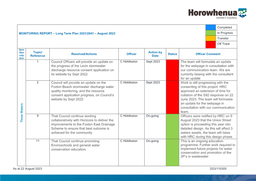 1. Purpose 1.1 To present to Te Awahou Foxton Community Board the updated monitoring report covering requested actions from previous meetings of the Board. This report incorporates updates related to the Foxton and Foxton Beach areas from the Long Term Plan Monitoring Report presented to Council on 19 July 2023 |