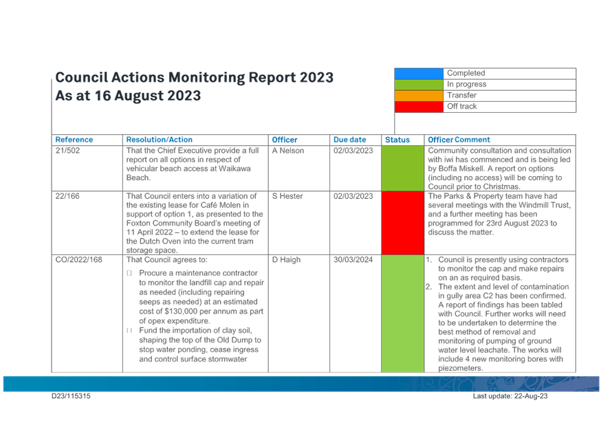 Te Awahou Foxton Community Board - Actions Monitoring Report - July 2023 |