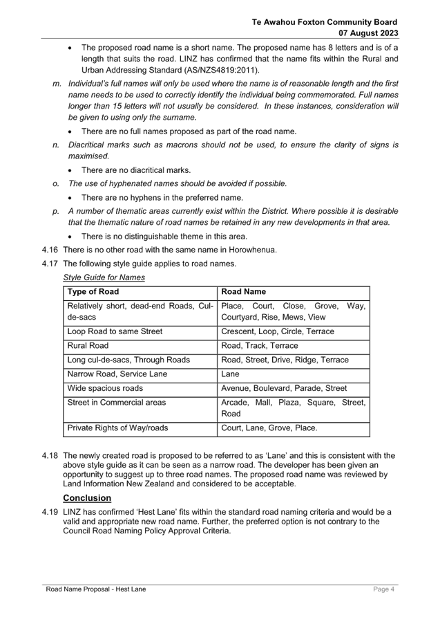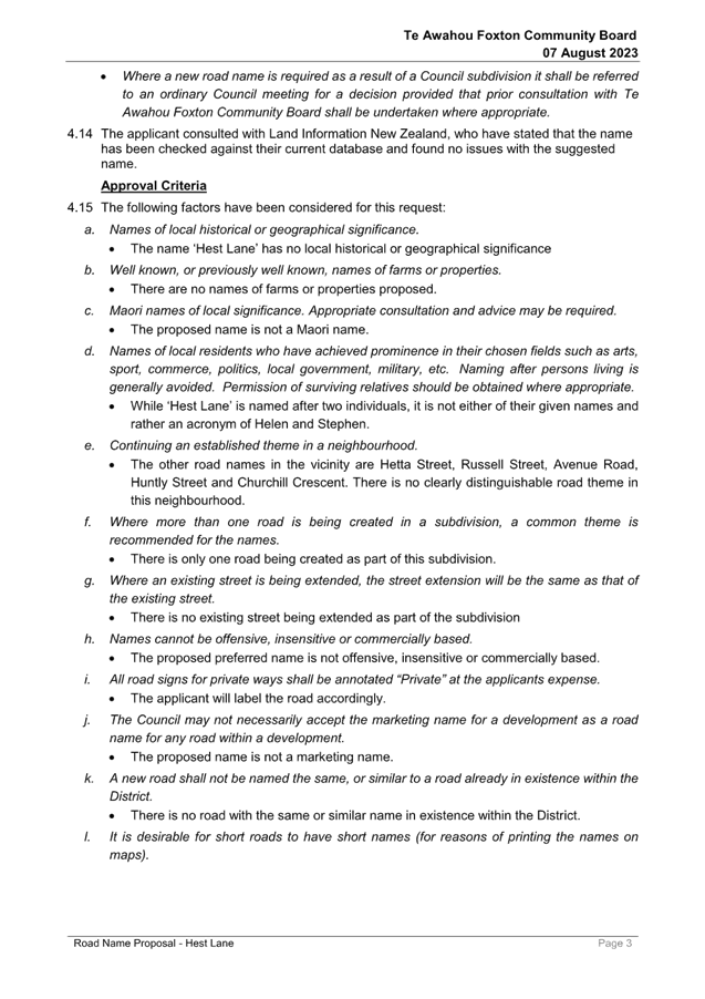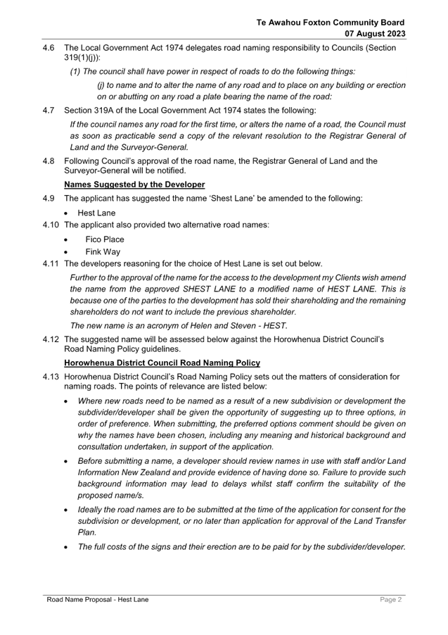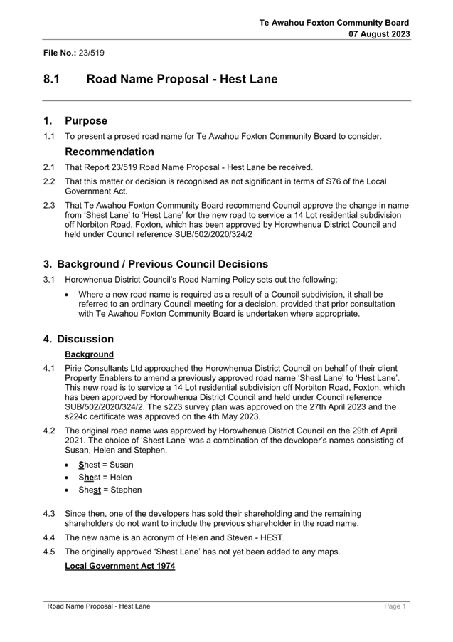 Resolution Number TAFCB/2023/72 MOVED by Mr Girling, seconded Mr Roache: 2.1 That Report 23/519 Road Name Proposal - Hest Lane be received. 2.2 That this matter or decision is recognised as not significant in terms of S76 of the Local Government Act. Carried |