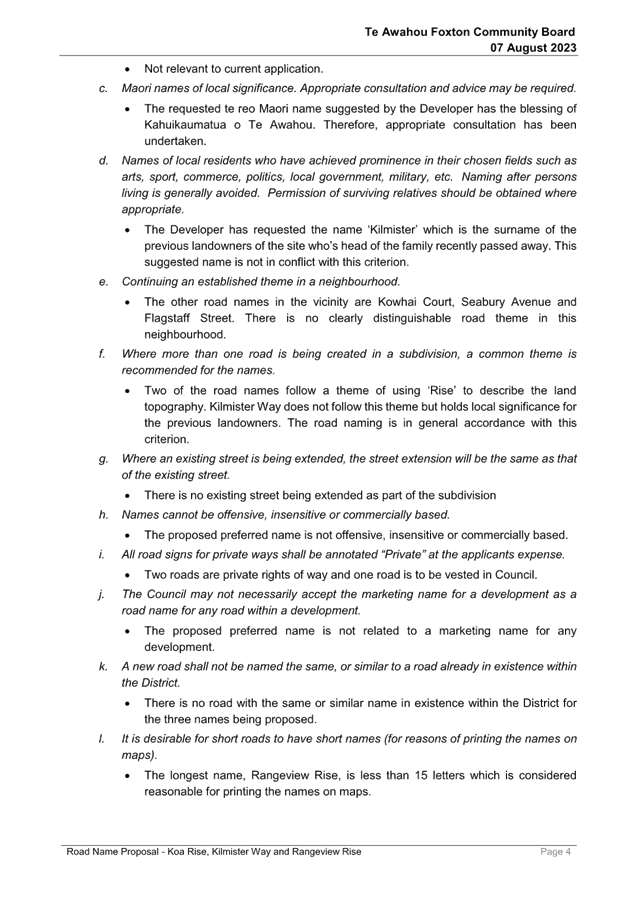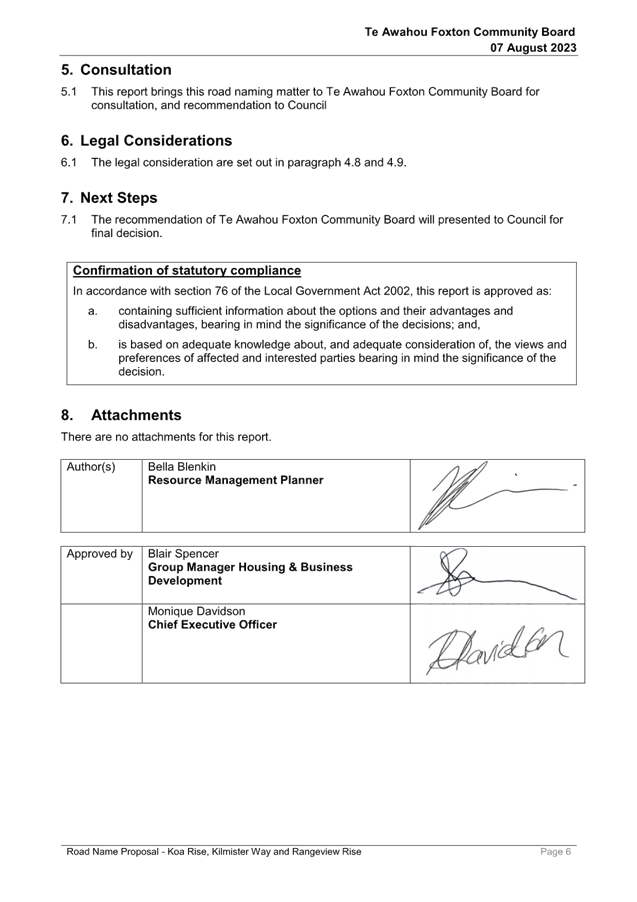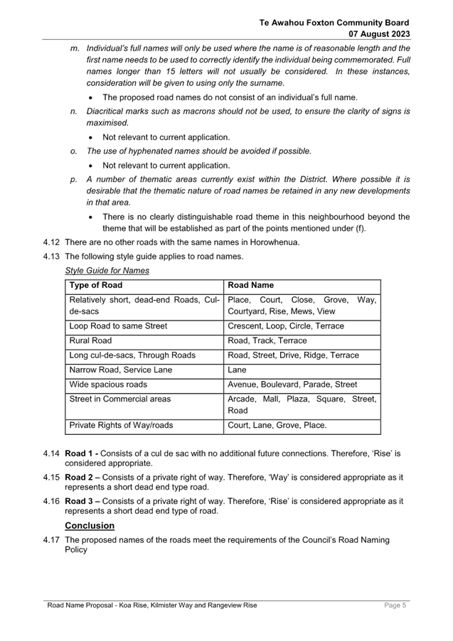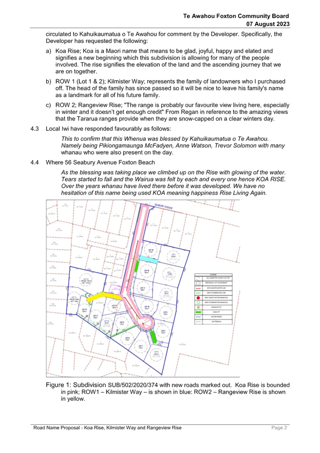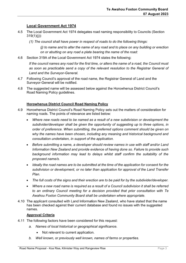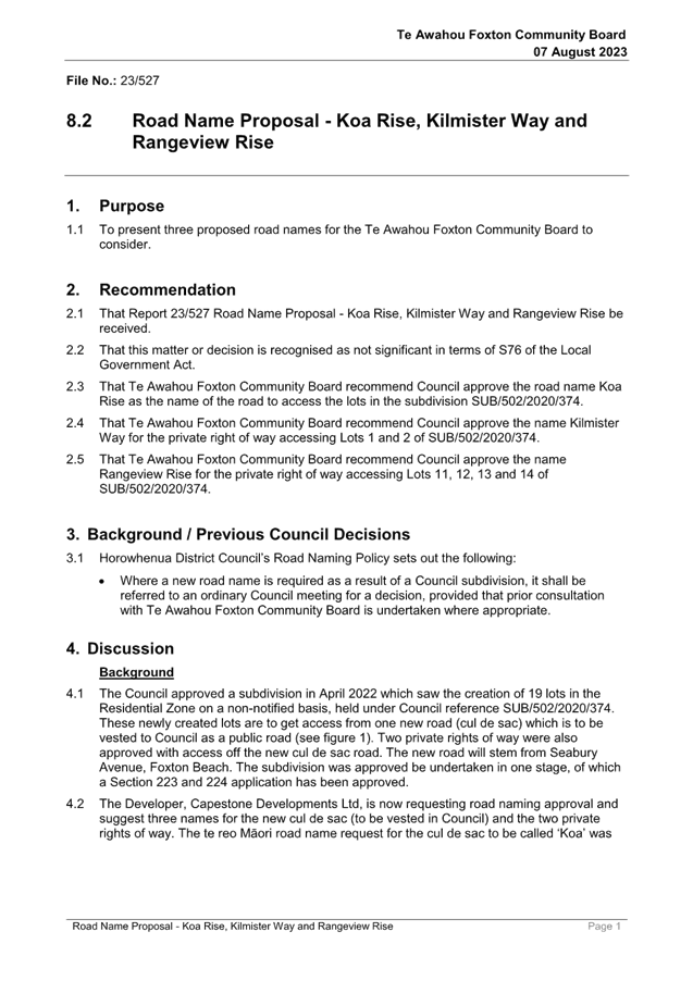 Resolution Number TAFCB/2023/74 MOVED by Mr Girling, seconded Mrs Fox: 2.1 That Report 23/527 Road Name Proposal - Koa Rise, Kilmister Way and Rangeview Rise be received. 2.2 That this matter or decision is recognised as not significant in terms of S76 of the Local Government Act. Carried |